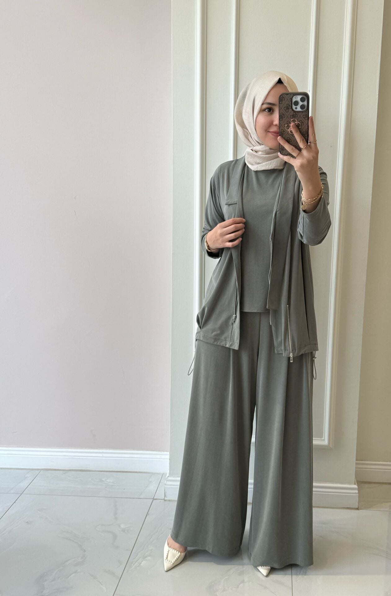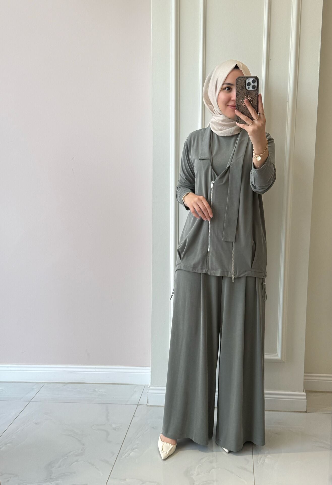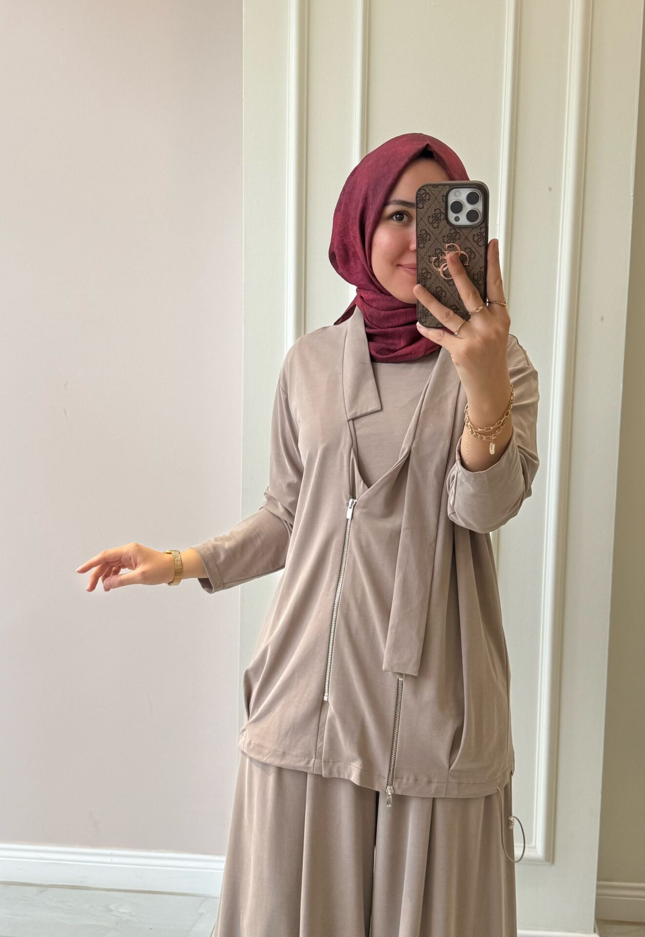 Ürünümüz 3 parçadır. İçlik sıfır koldur. İçlik boyu 53 cm, Hırka boyu 73 cm'dir.