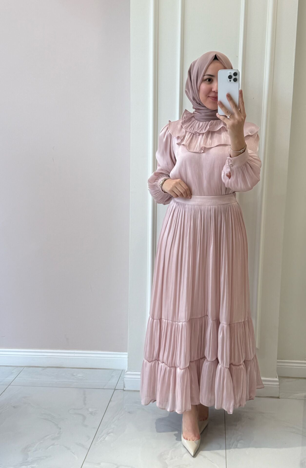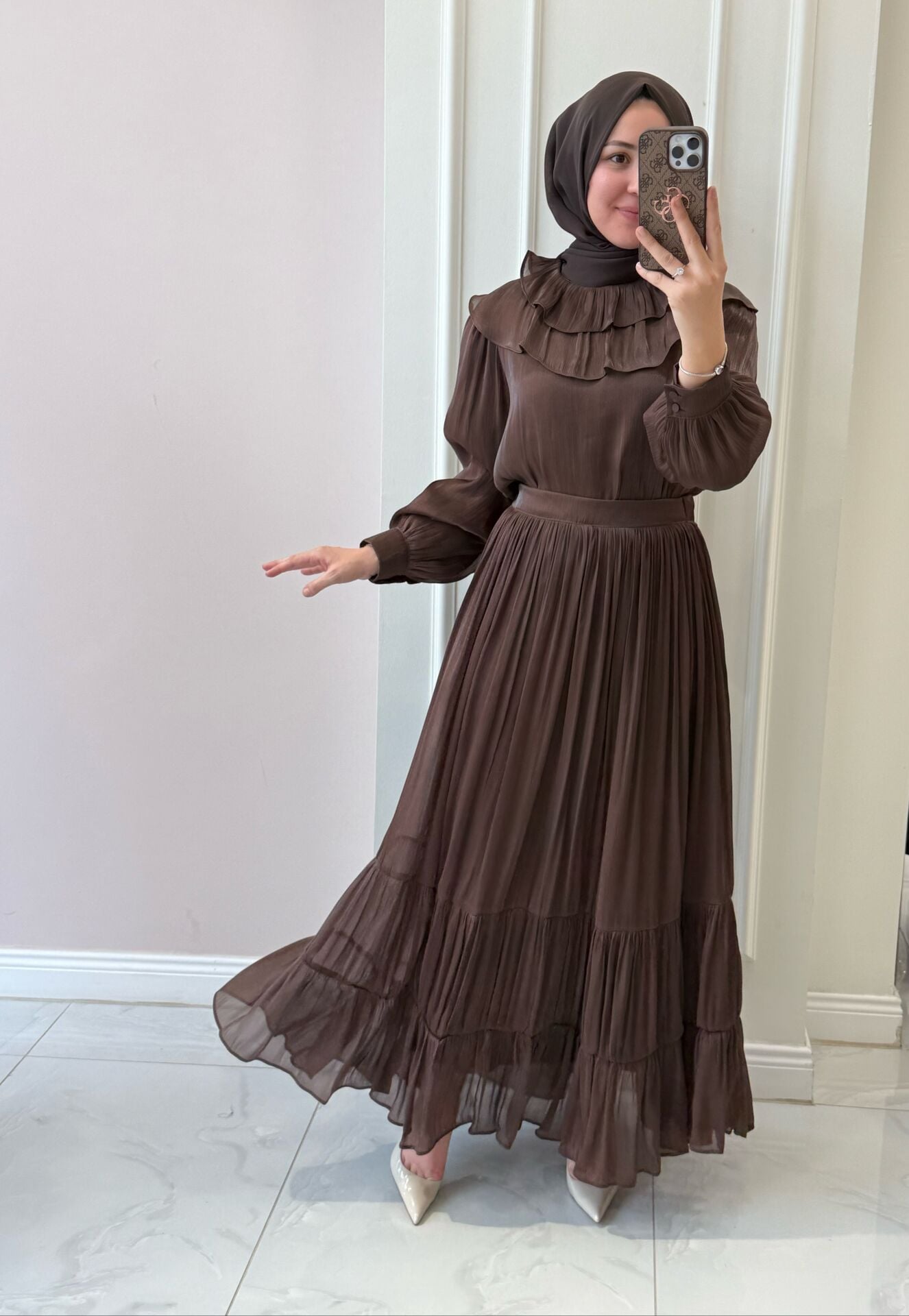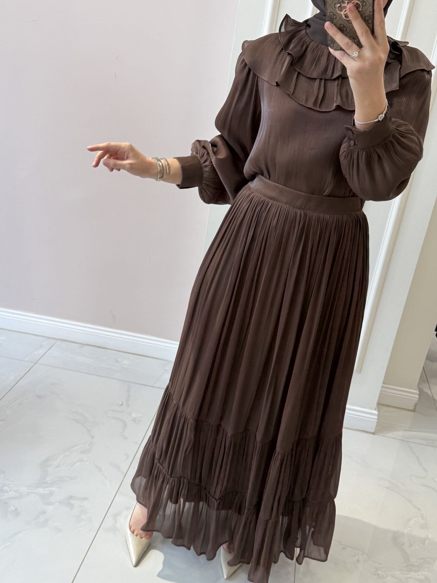 Janjanlı şifon kumaştır. İçi astarlıdır