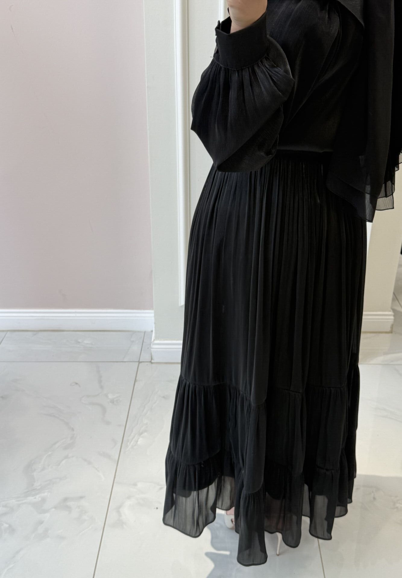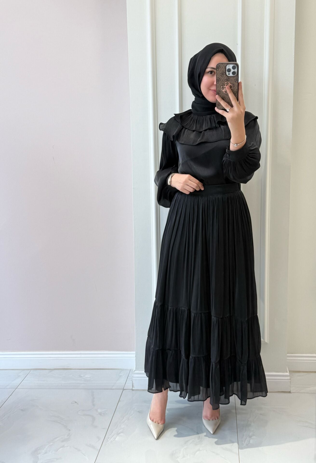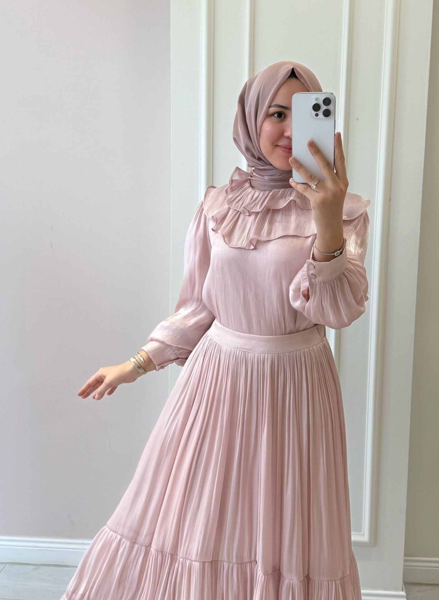 Janjanlı şifon kumaştır. İçi astarlıdır