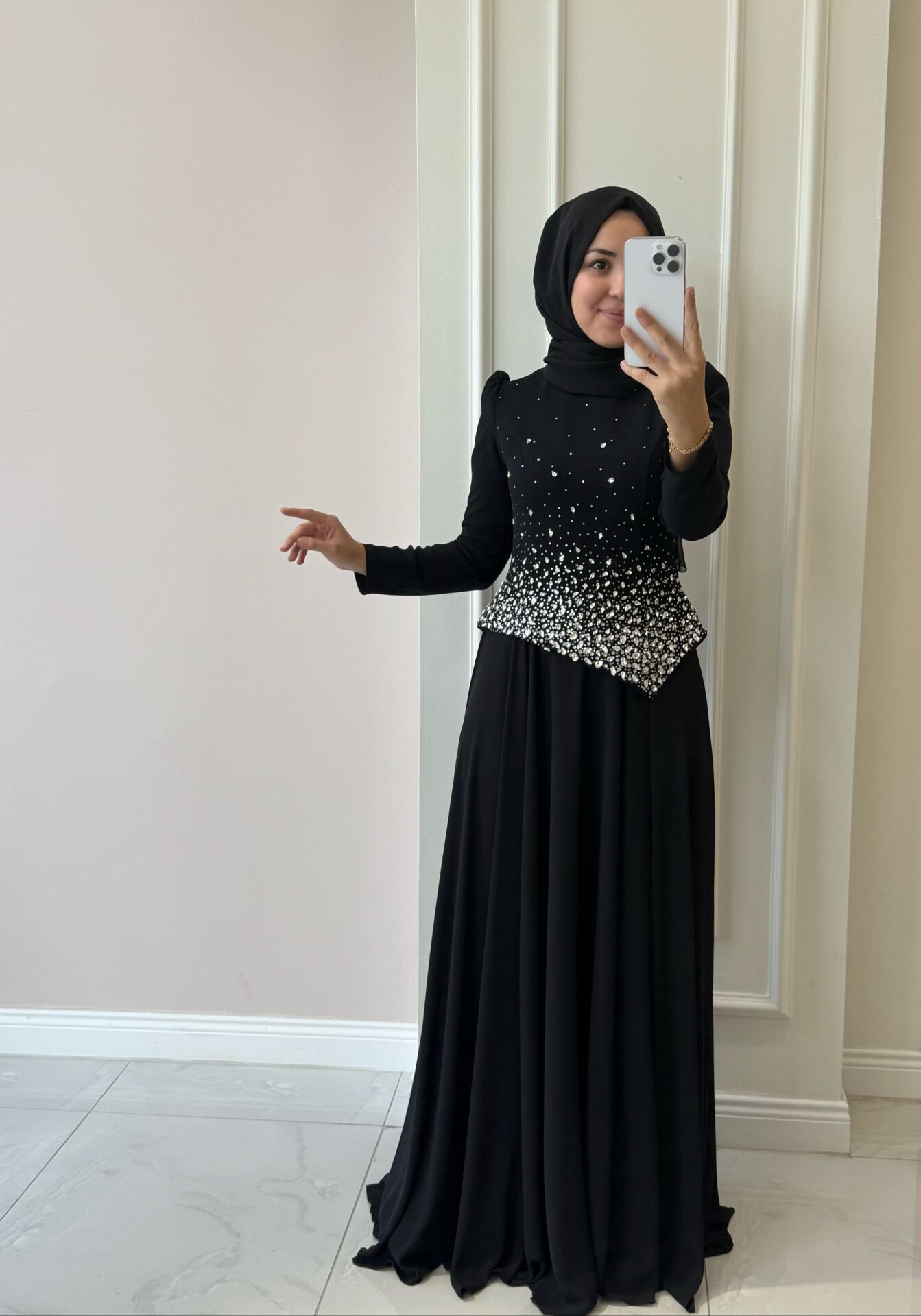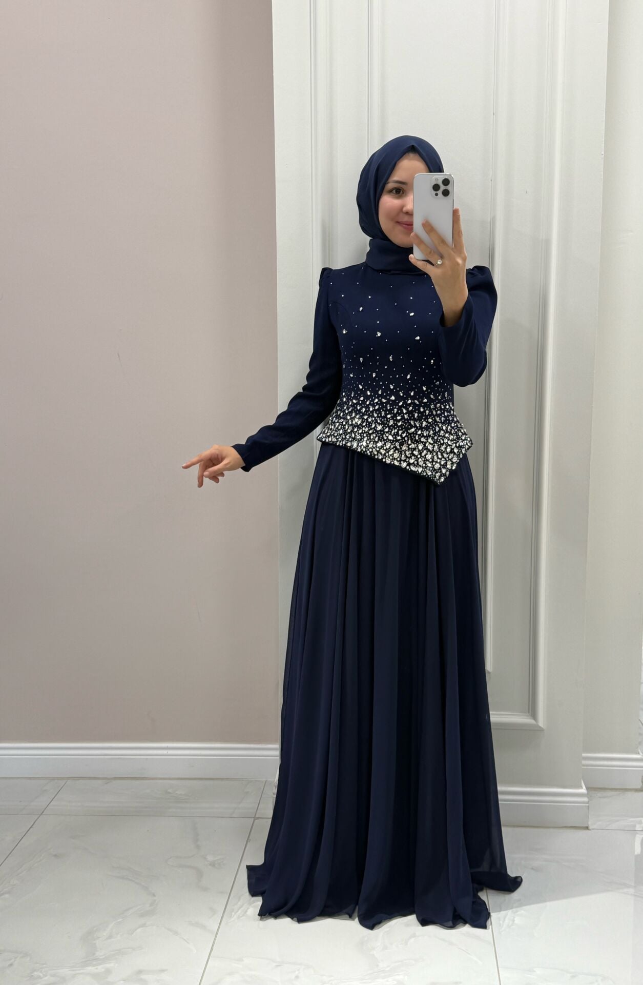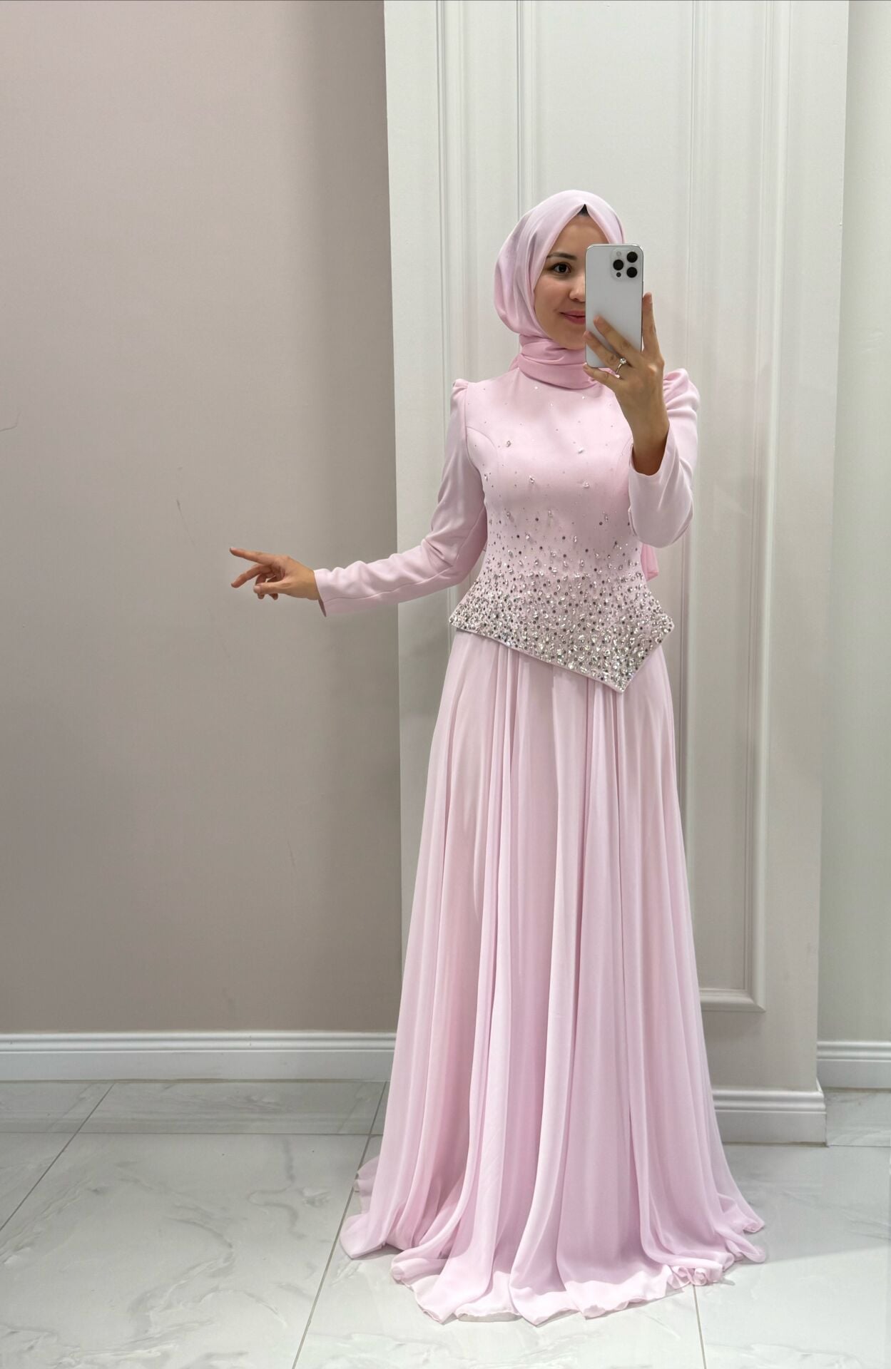 Abiyemiz tam kalıptır. Manken üzerindeki 38 bedendir.