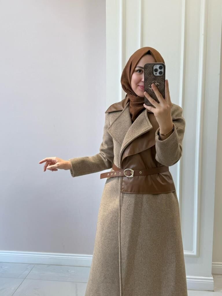 6177 Deri Detaylı Kaşe Kaban
