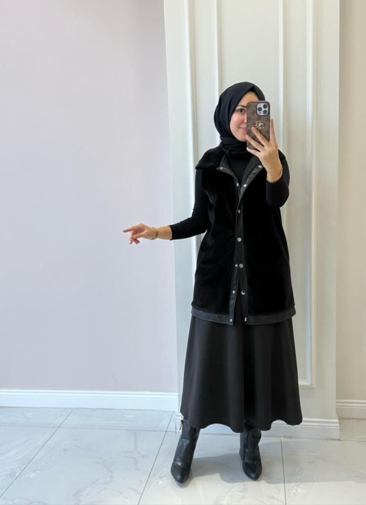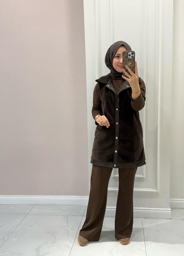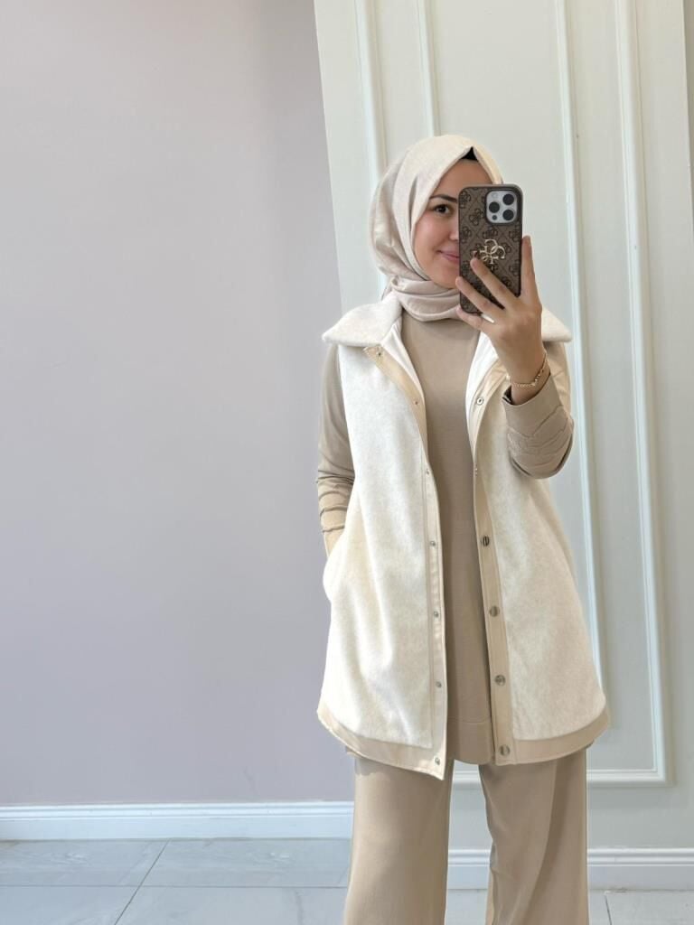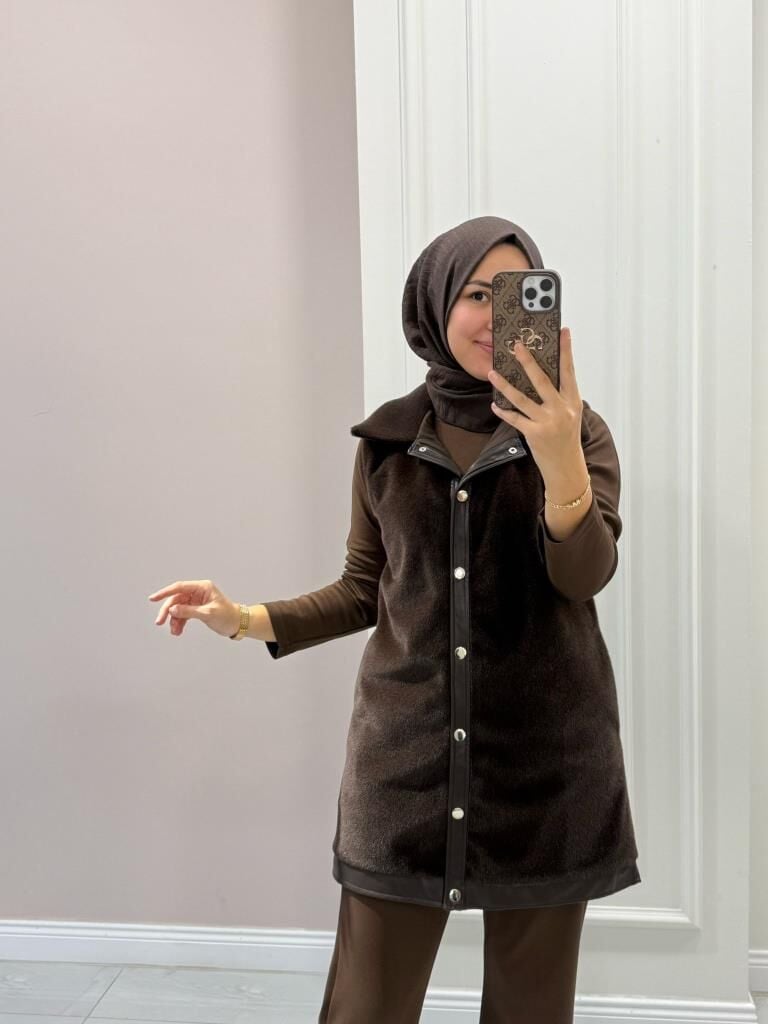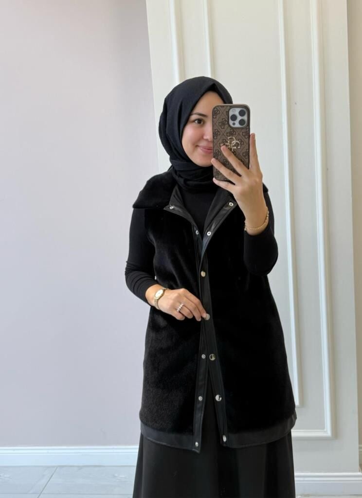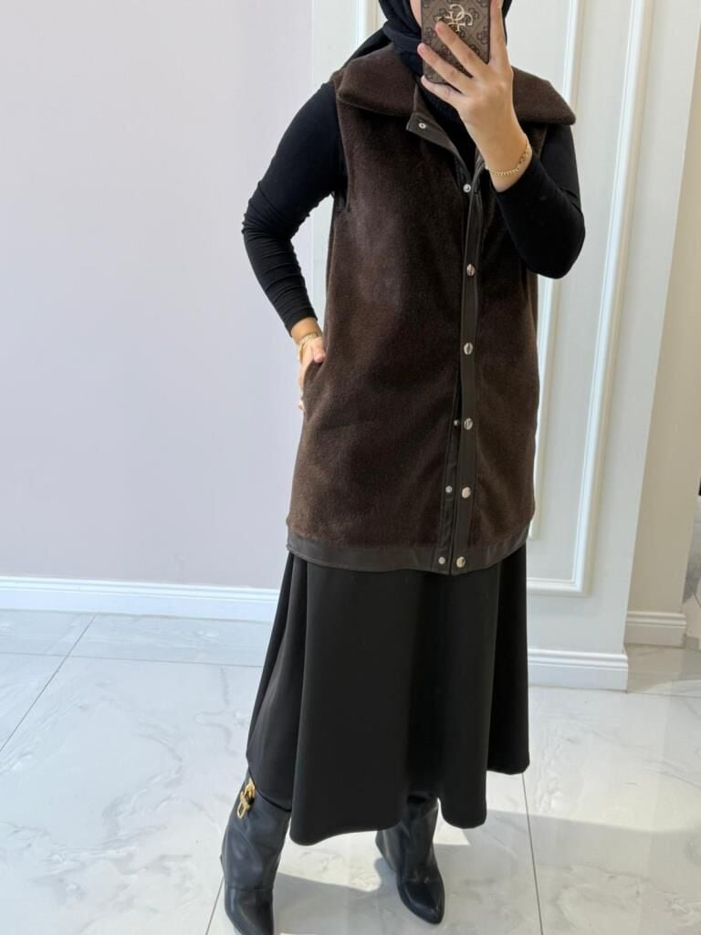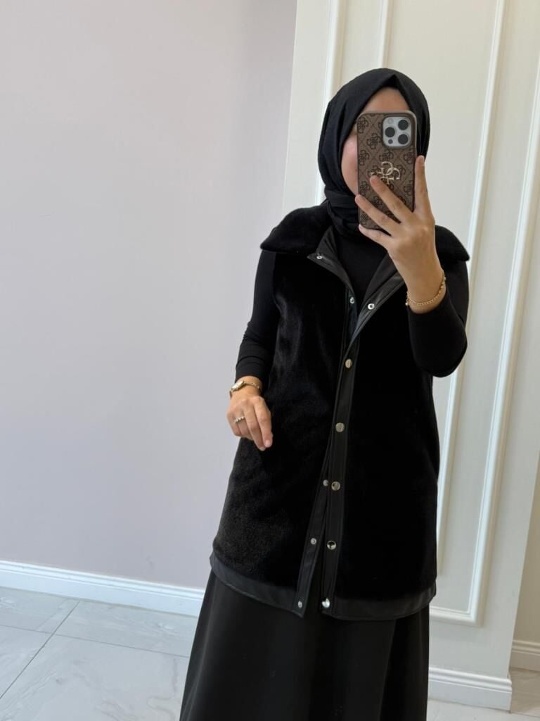 Kadın 9280 Deri Detaylı Peluş Yelek