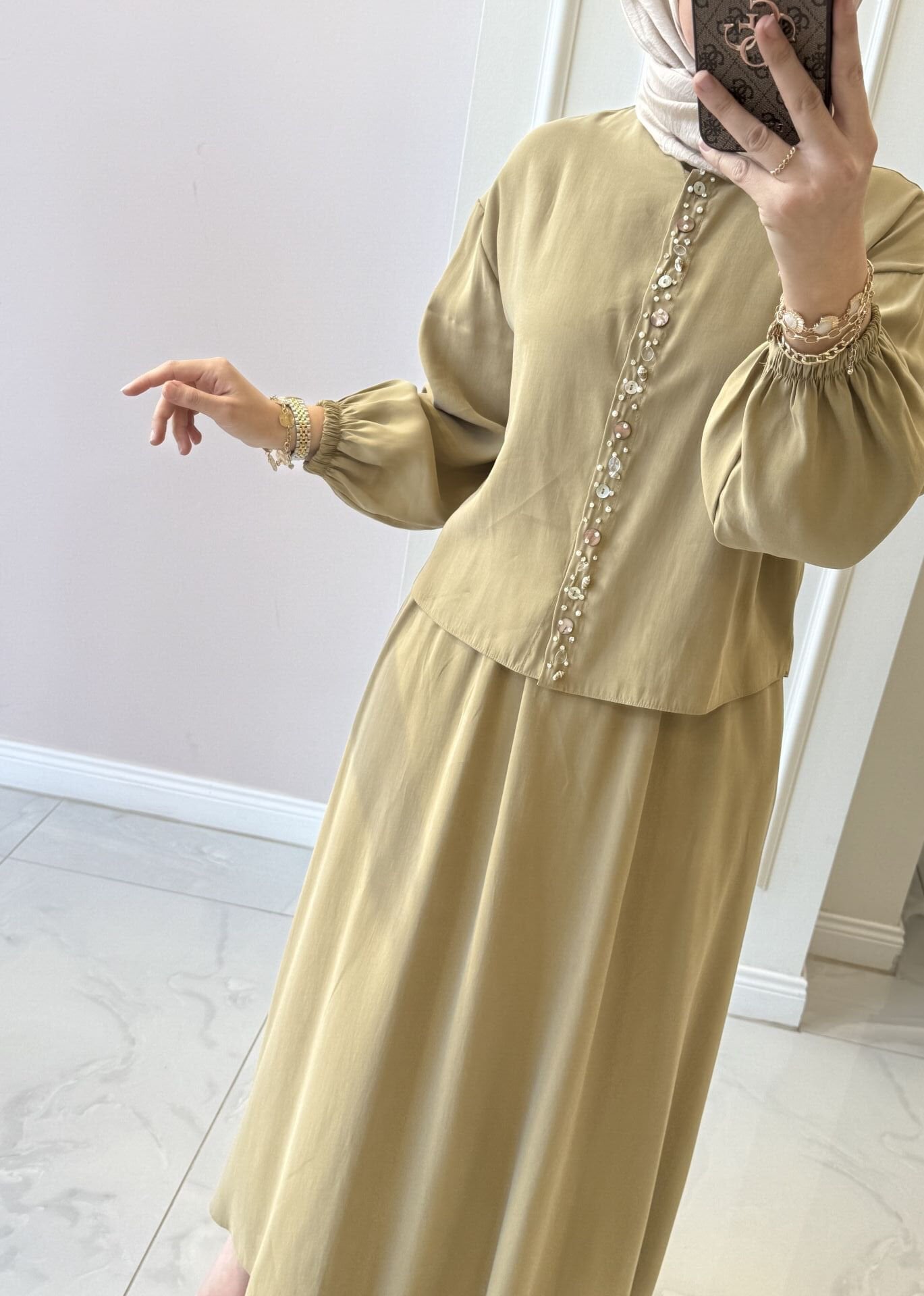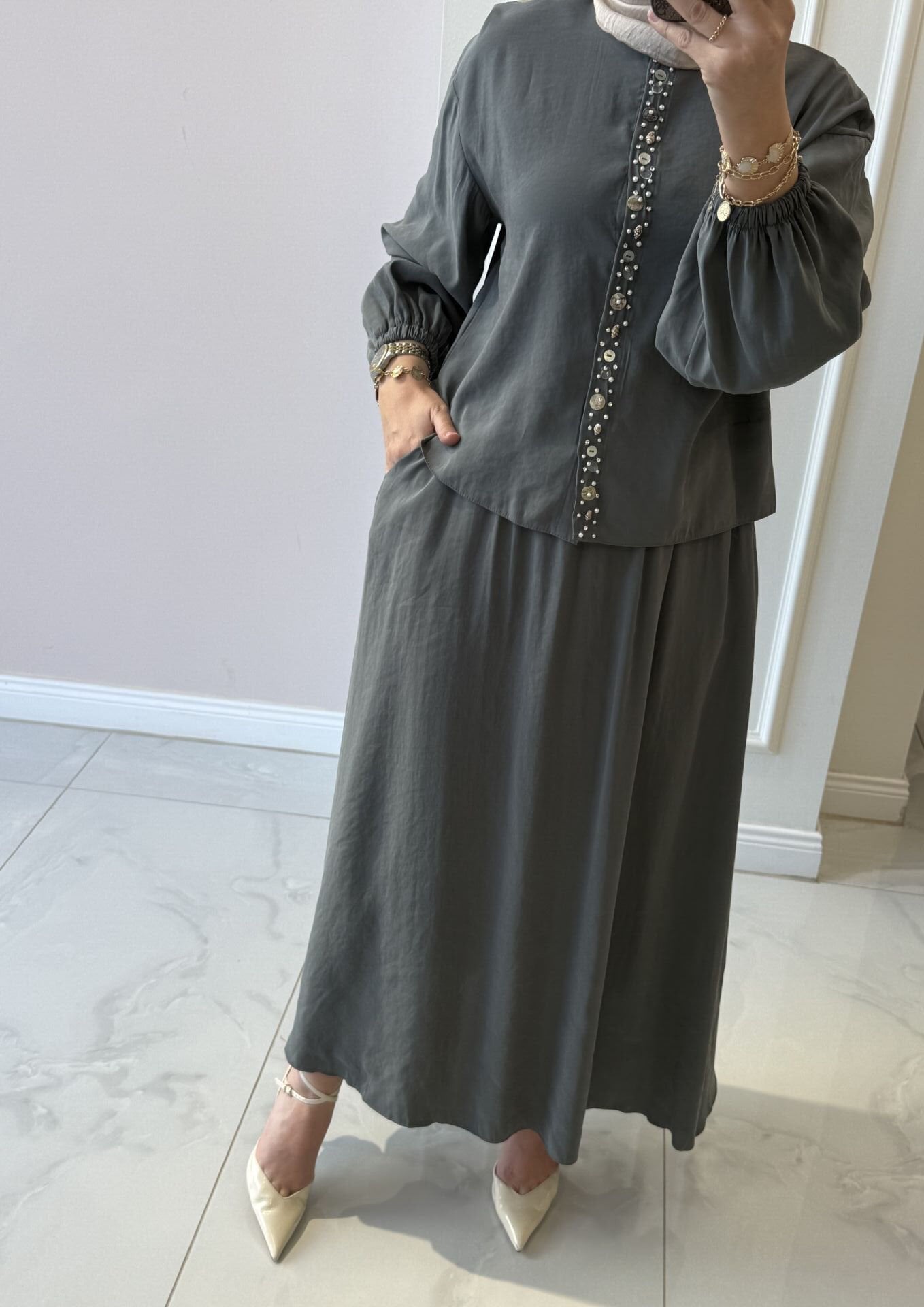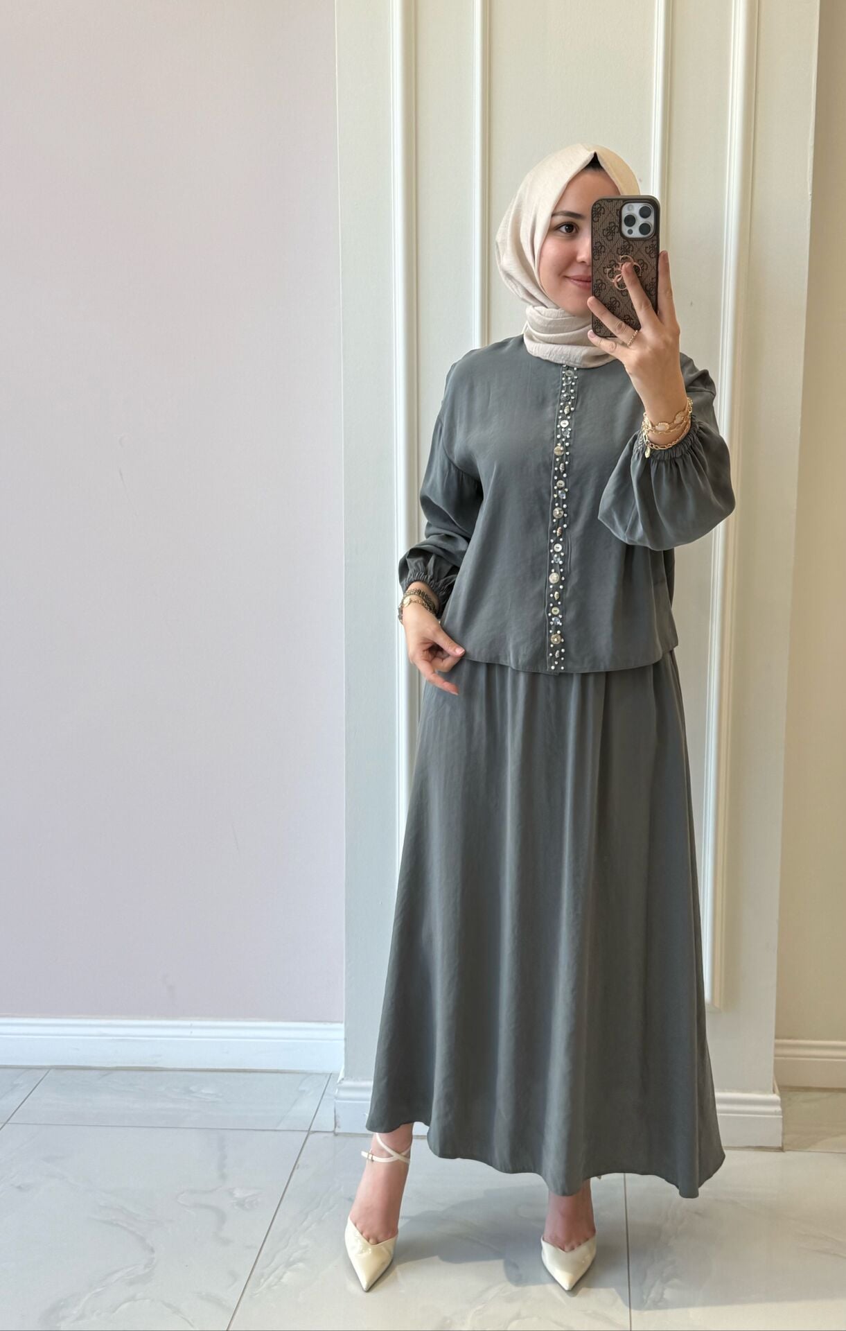 Takımımız tam kalıptır. Manken üzerindeki S/M bedendir. Etek beli lastiklidir.
