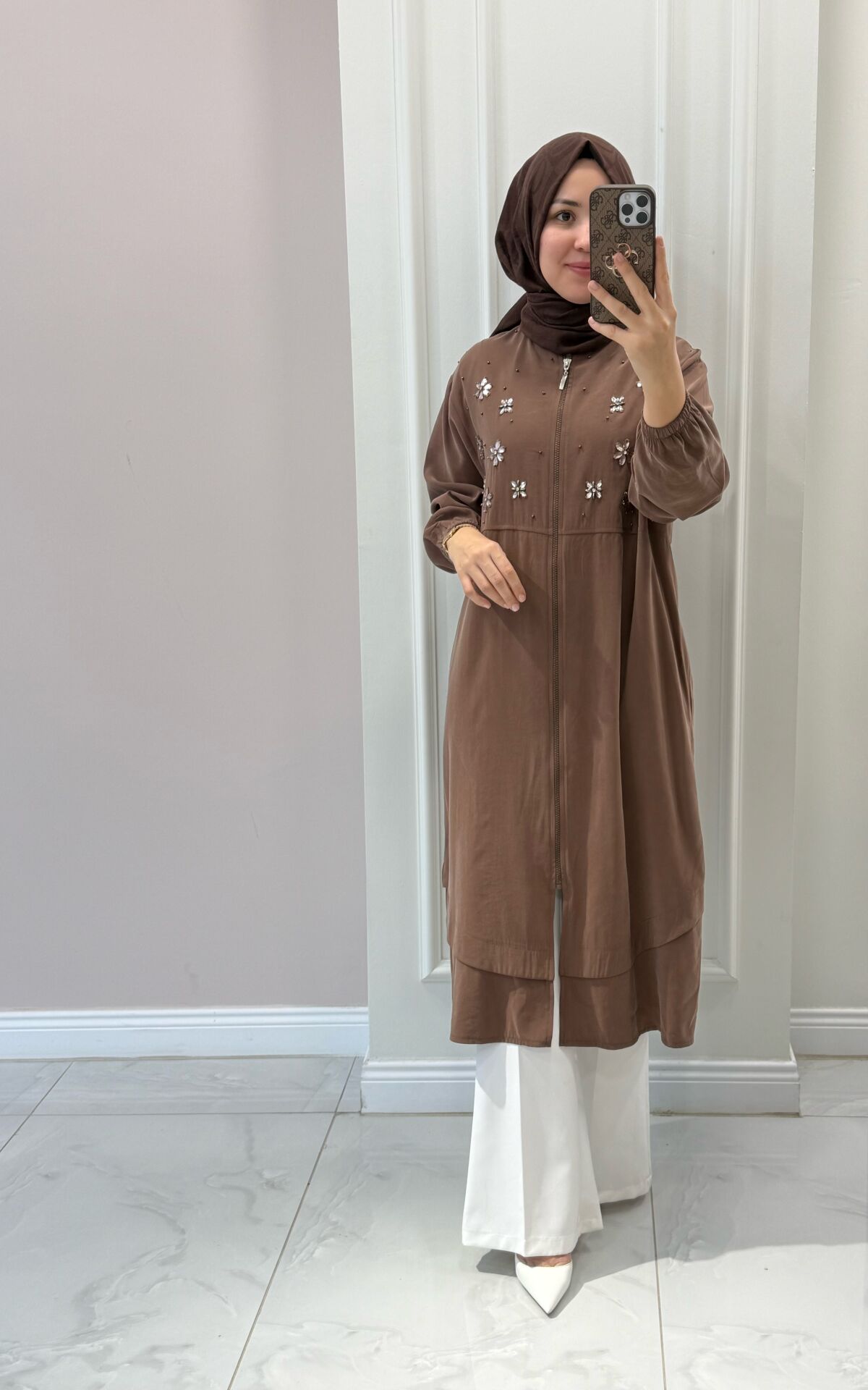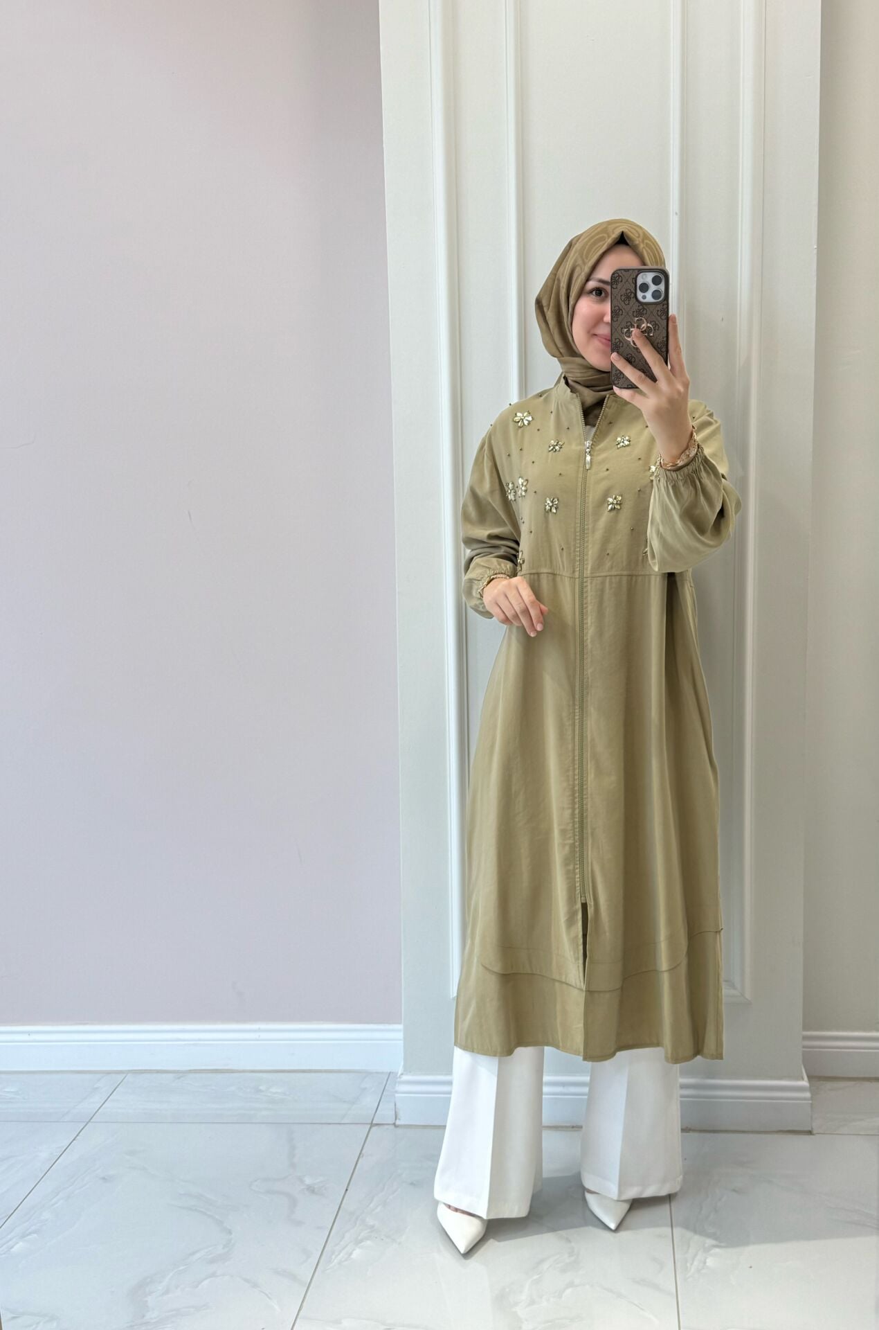 Manken üzerindeki 40 bedendir. Normalde giydiğiniz bedenden bir beden küçük tercih edebilirsiniz.