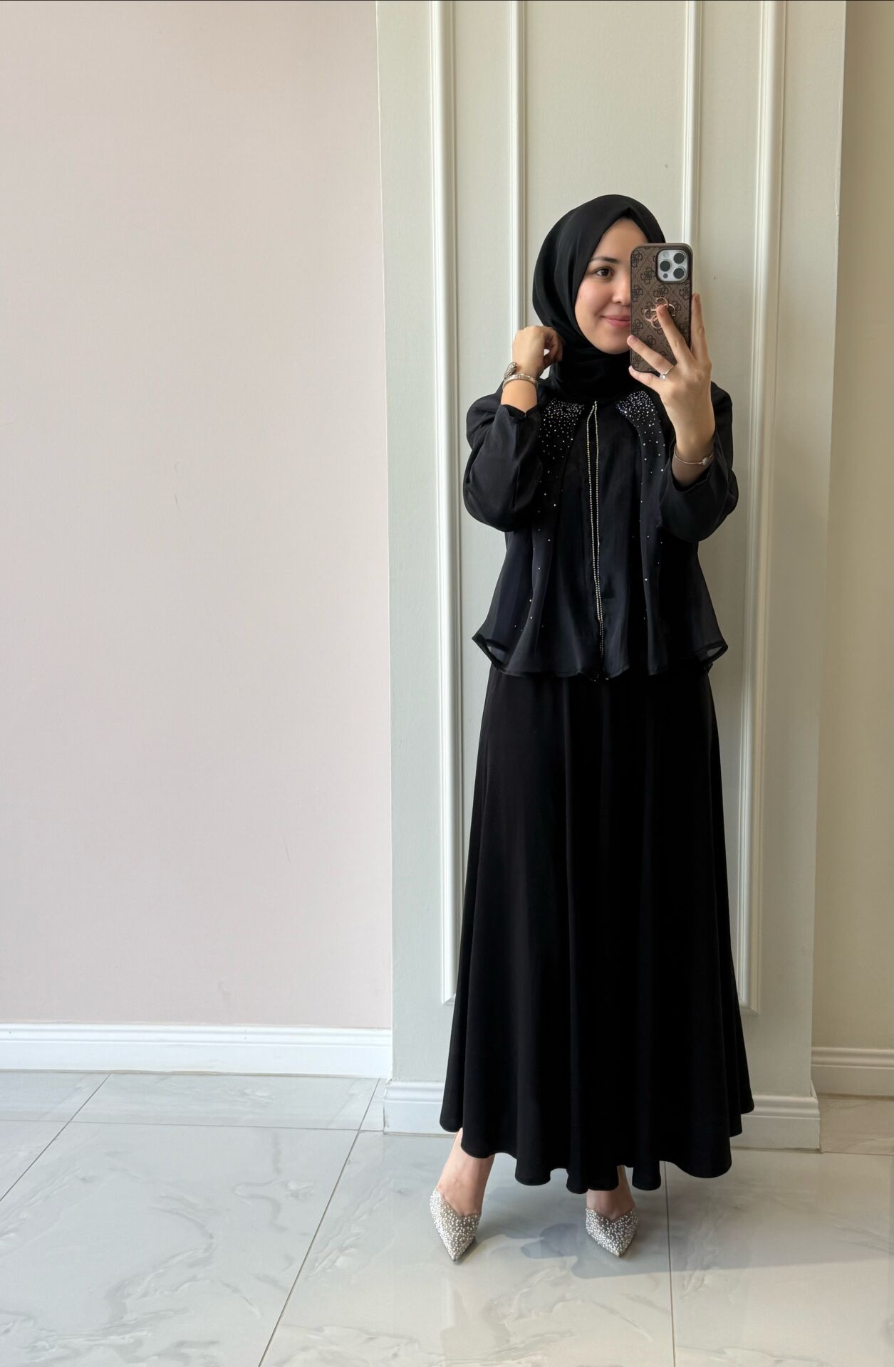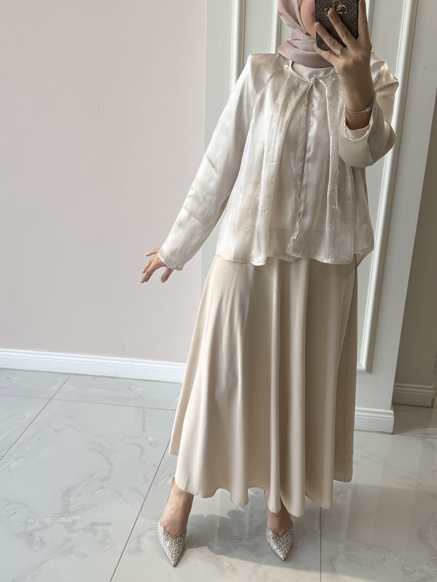 Ürünümüz krep kumaştır. Üst ceketi organze kumaştır.
