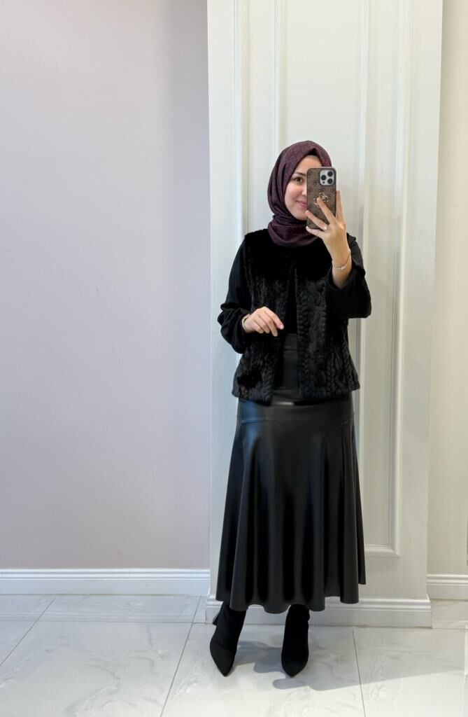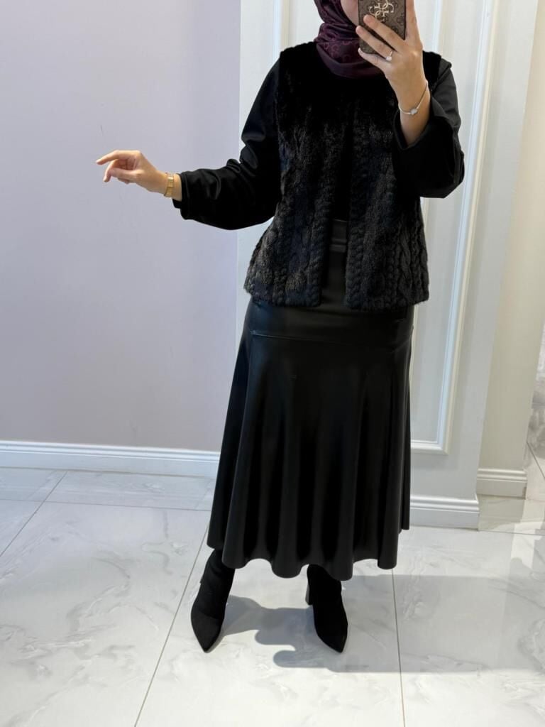 Ceket kürk detaylı, etek ise deri detaylıdır.
