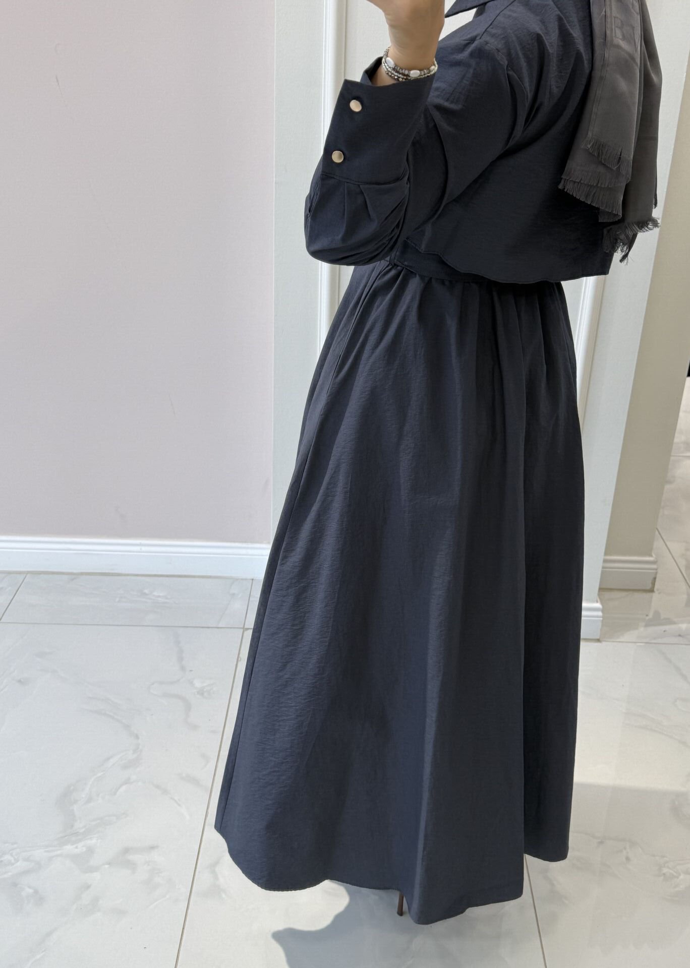 Kumaş: Özel yüzeyli, hafif krinkıl dokulu ithal dokuma kumaştır. Nefes alır, dökümlü durur. Bahar ve yaz aylarında kullanıma uygundur.