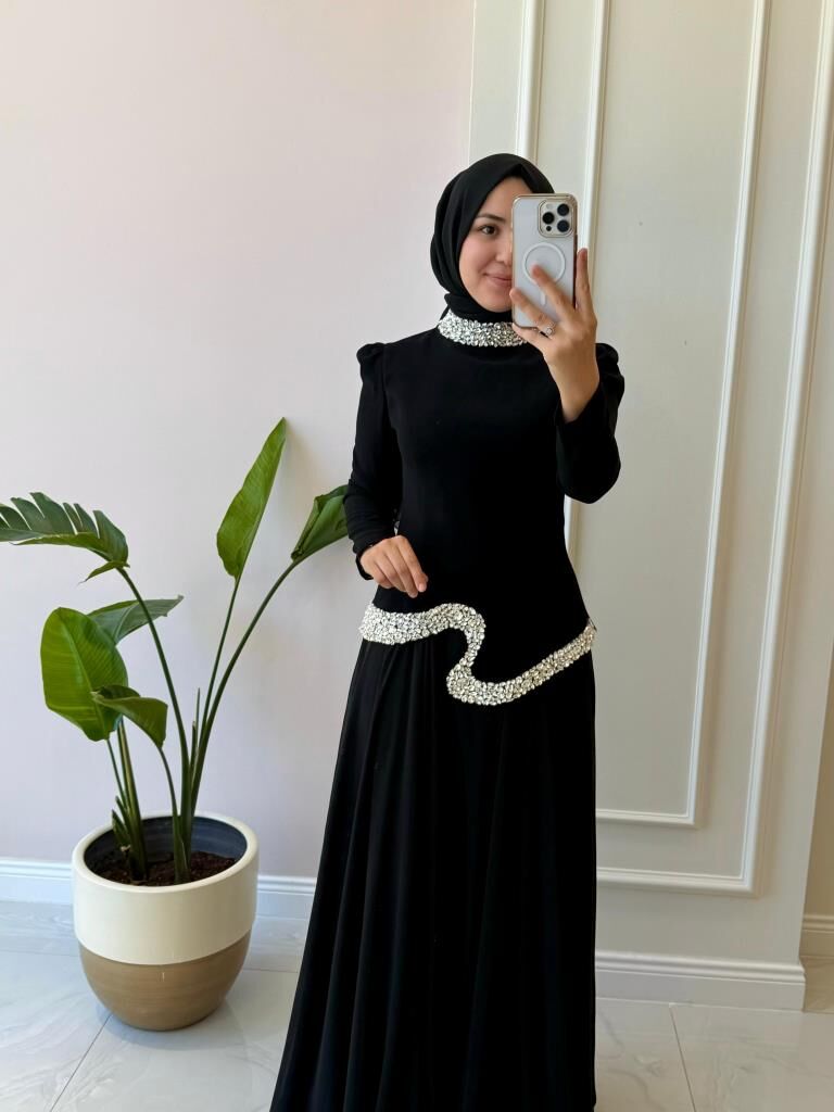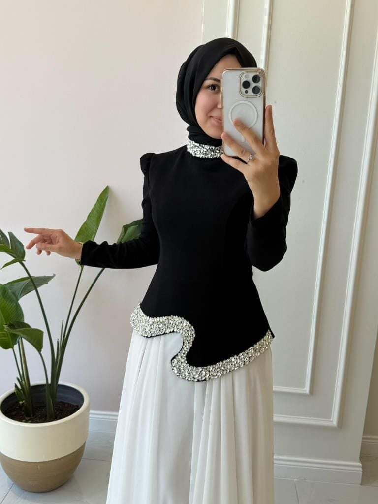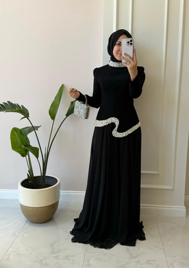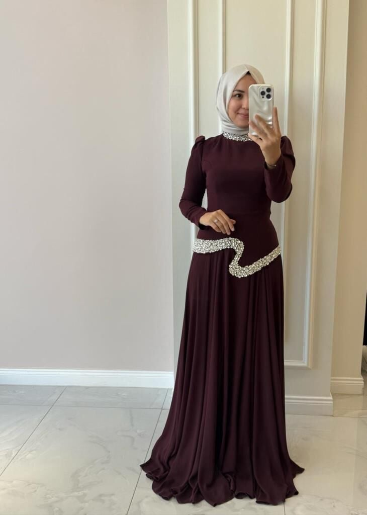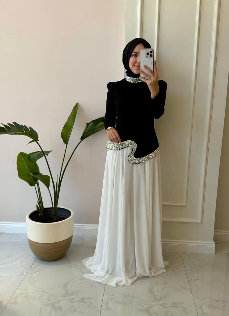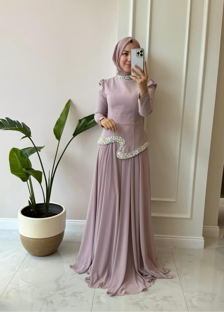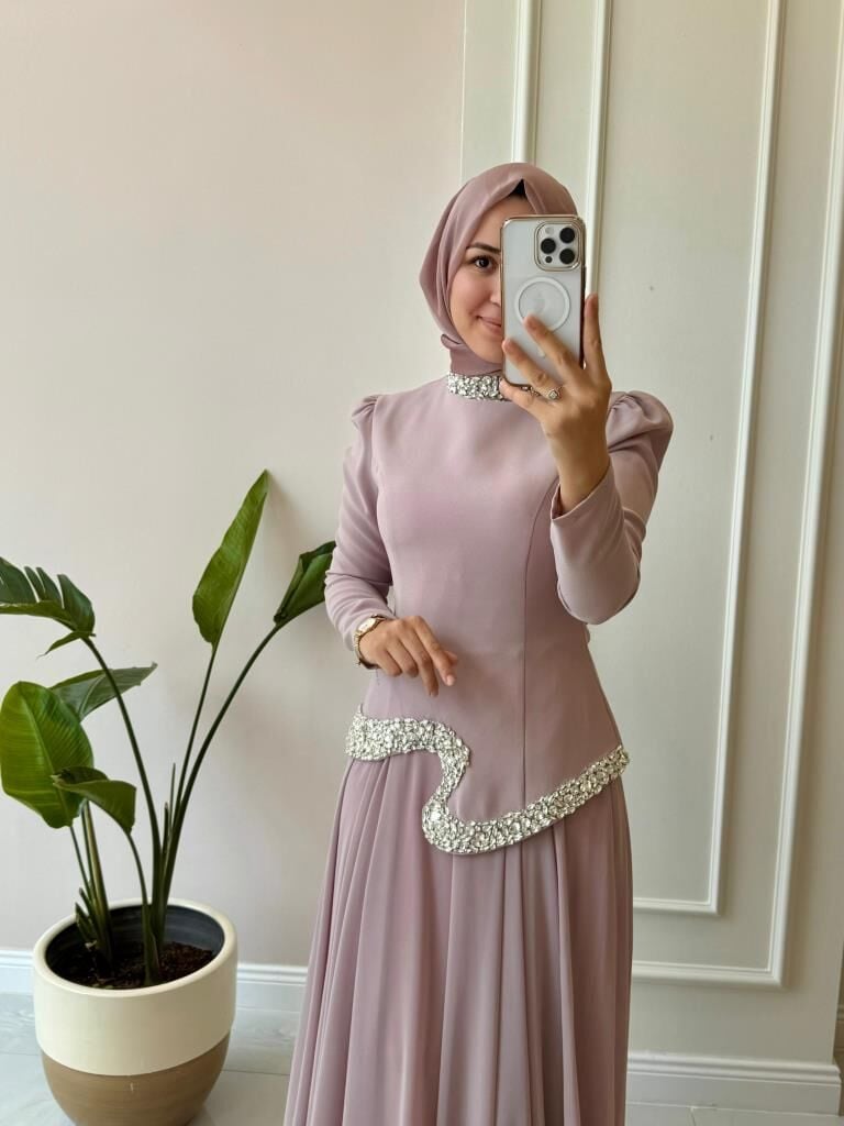 Ürünümüzün üst kısmı krep kumaş, etek kısmı içi astarlı şifon kumaştır.
