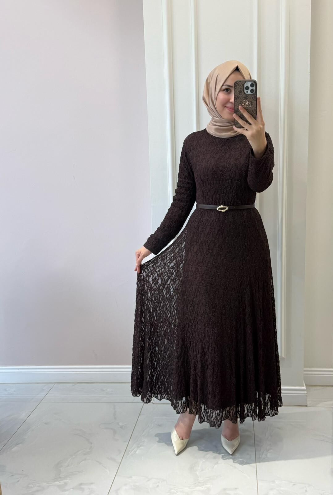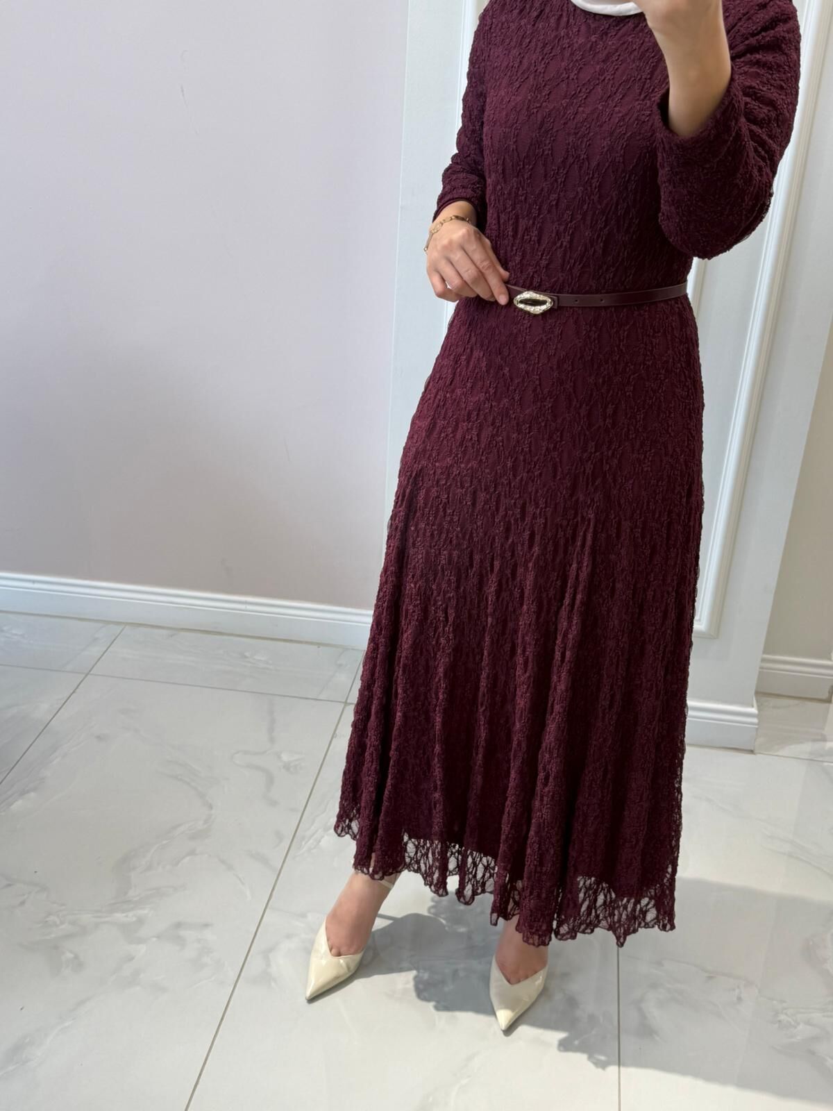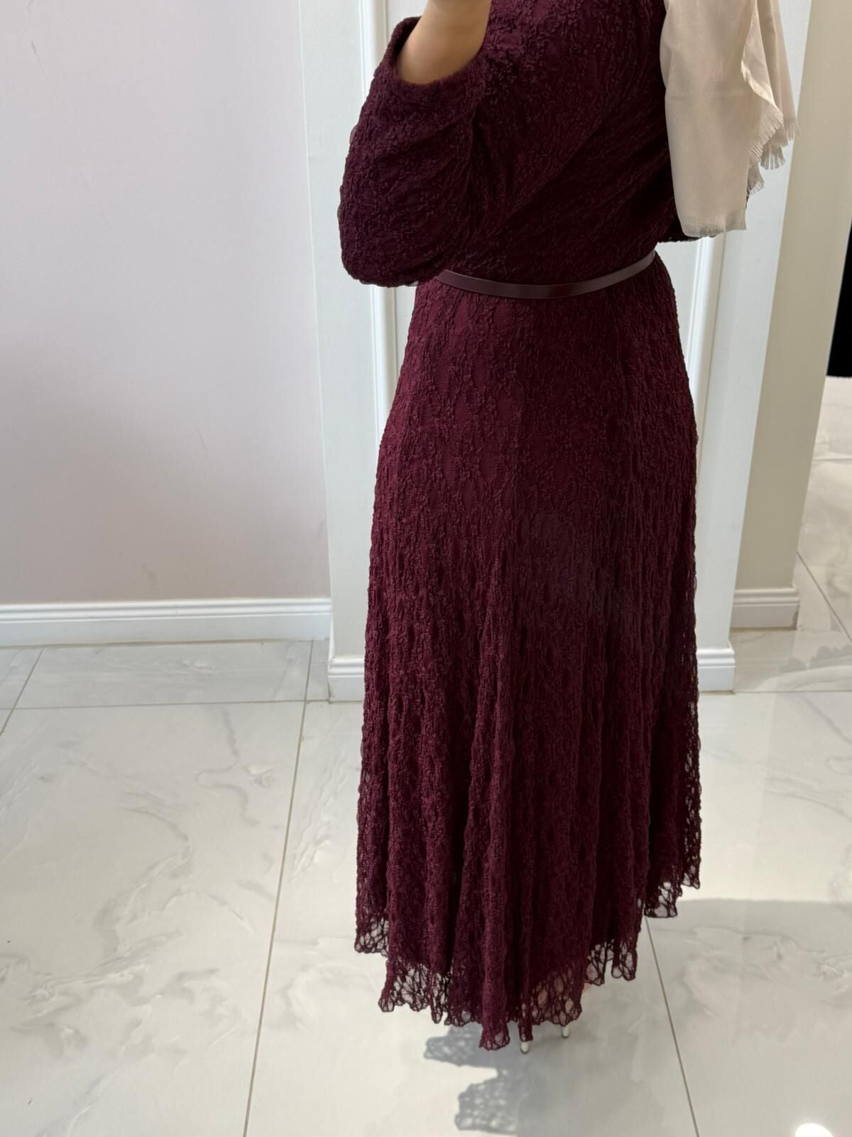 38/46 beden aralığında elbisemiz tam kalıptır. Manken üzerindeki 38 bedendir.