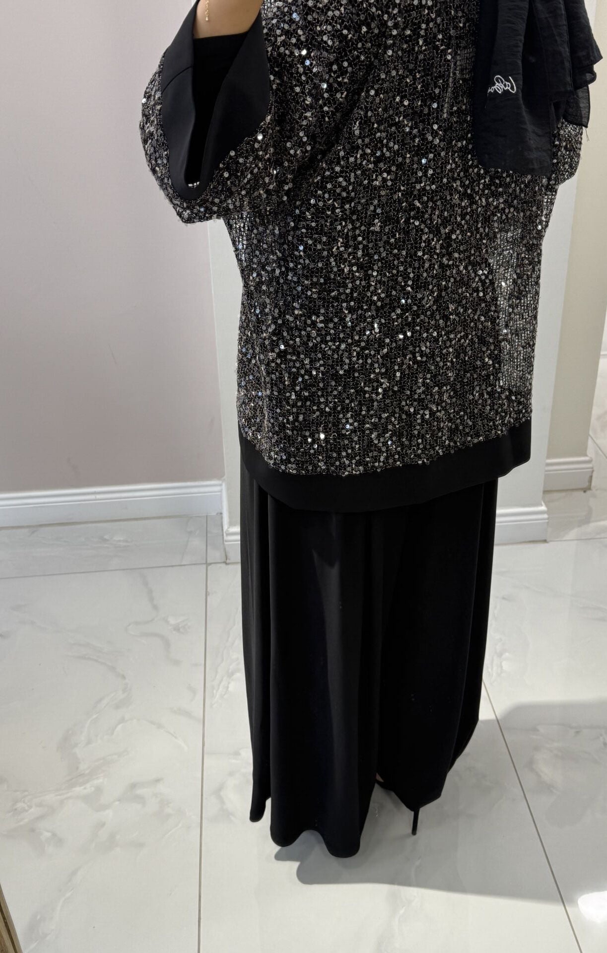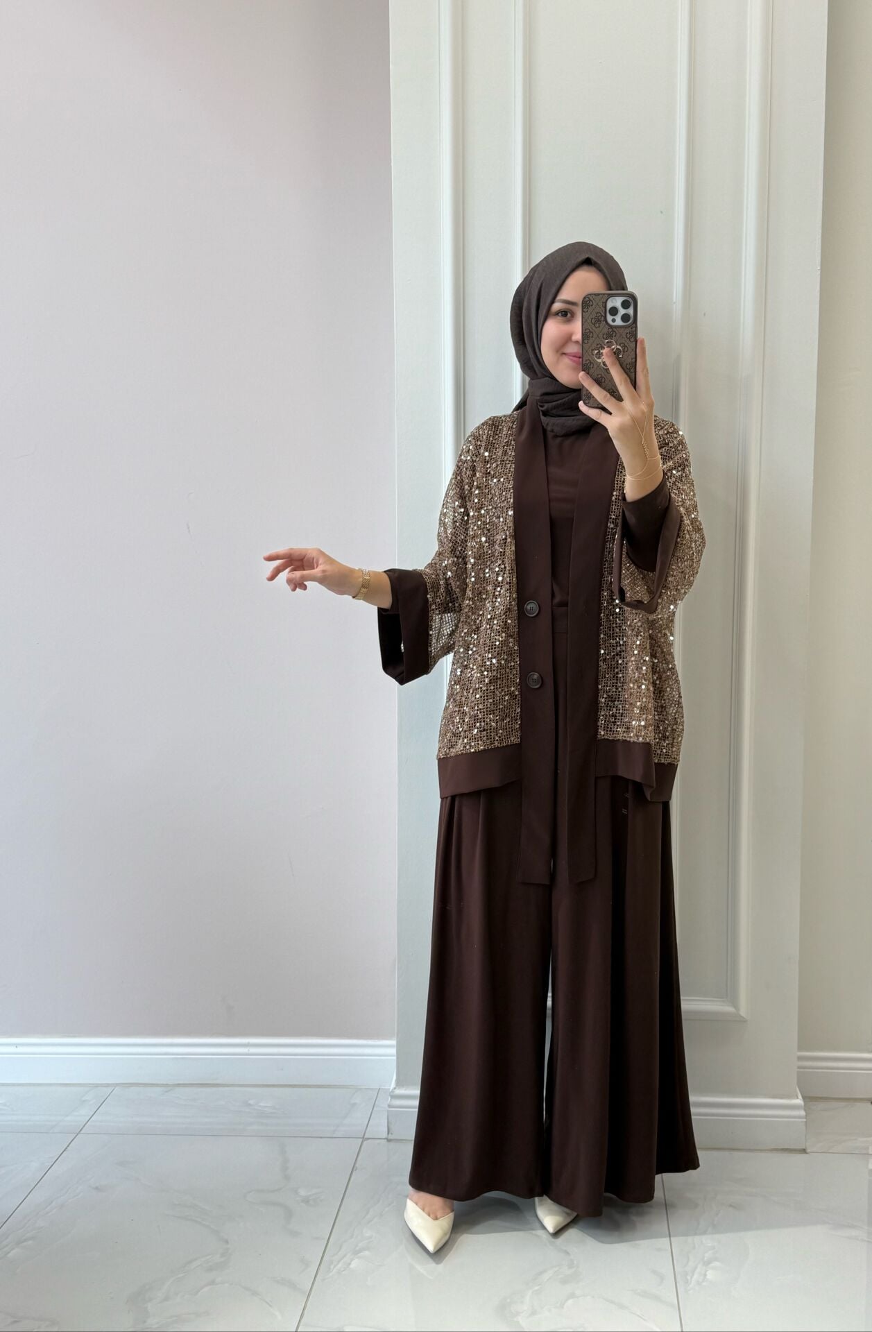 İç takımı krep likralı kumaştır. Hırkası pul payetli file kumaştır.