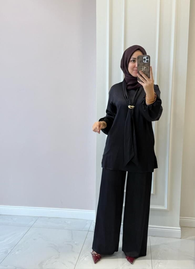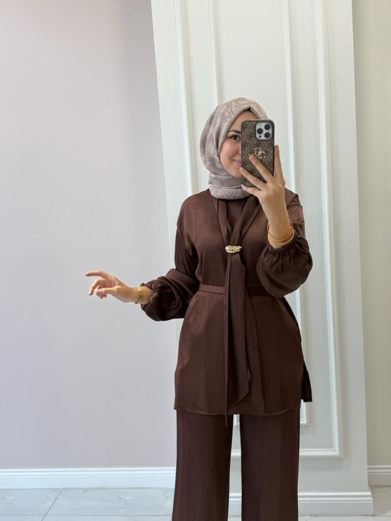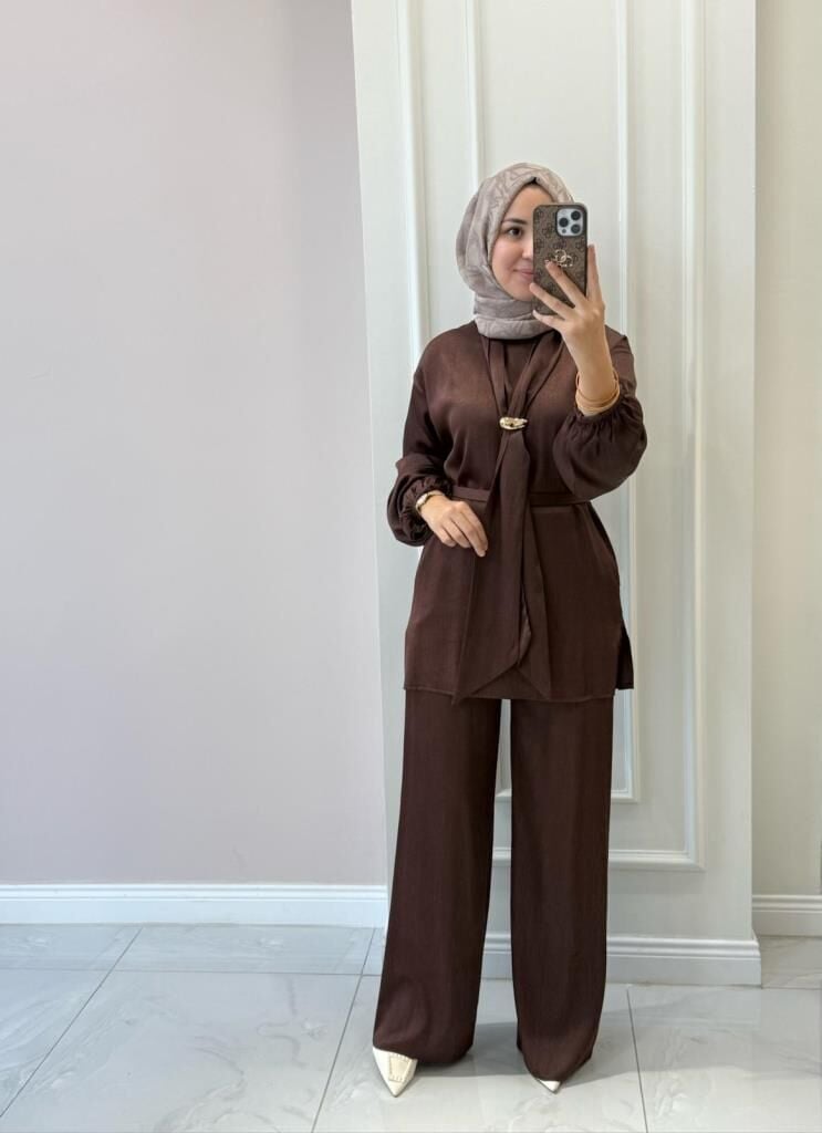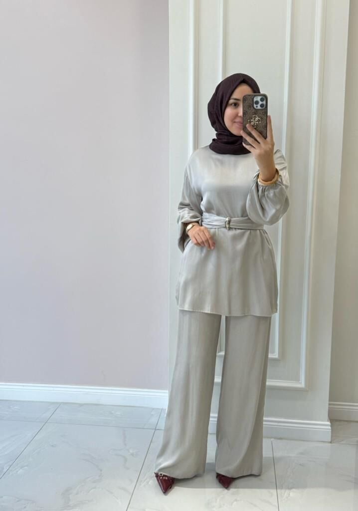 Pantolon ön kısmı kemerli, arka kısmı lastiklidir.
